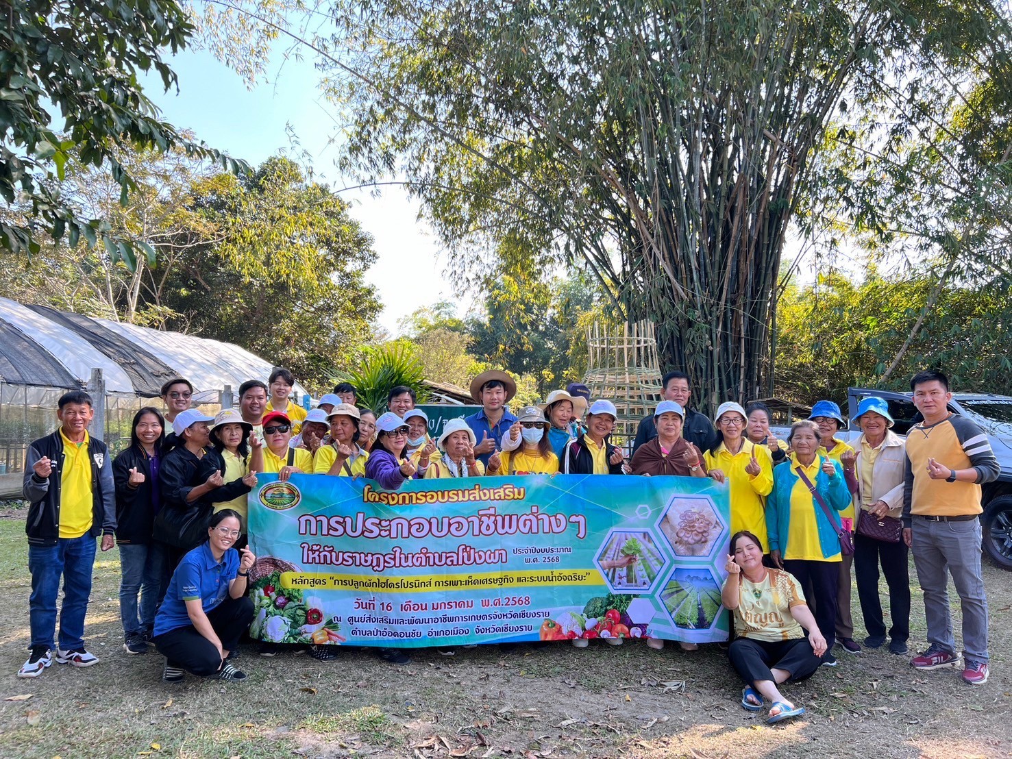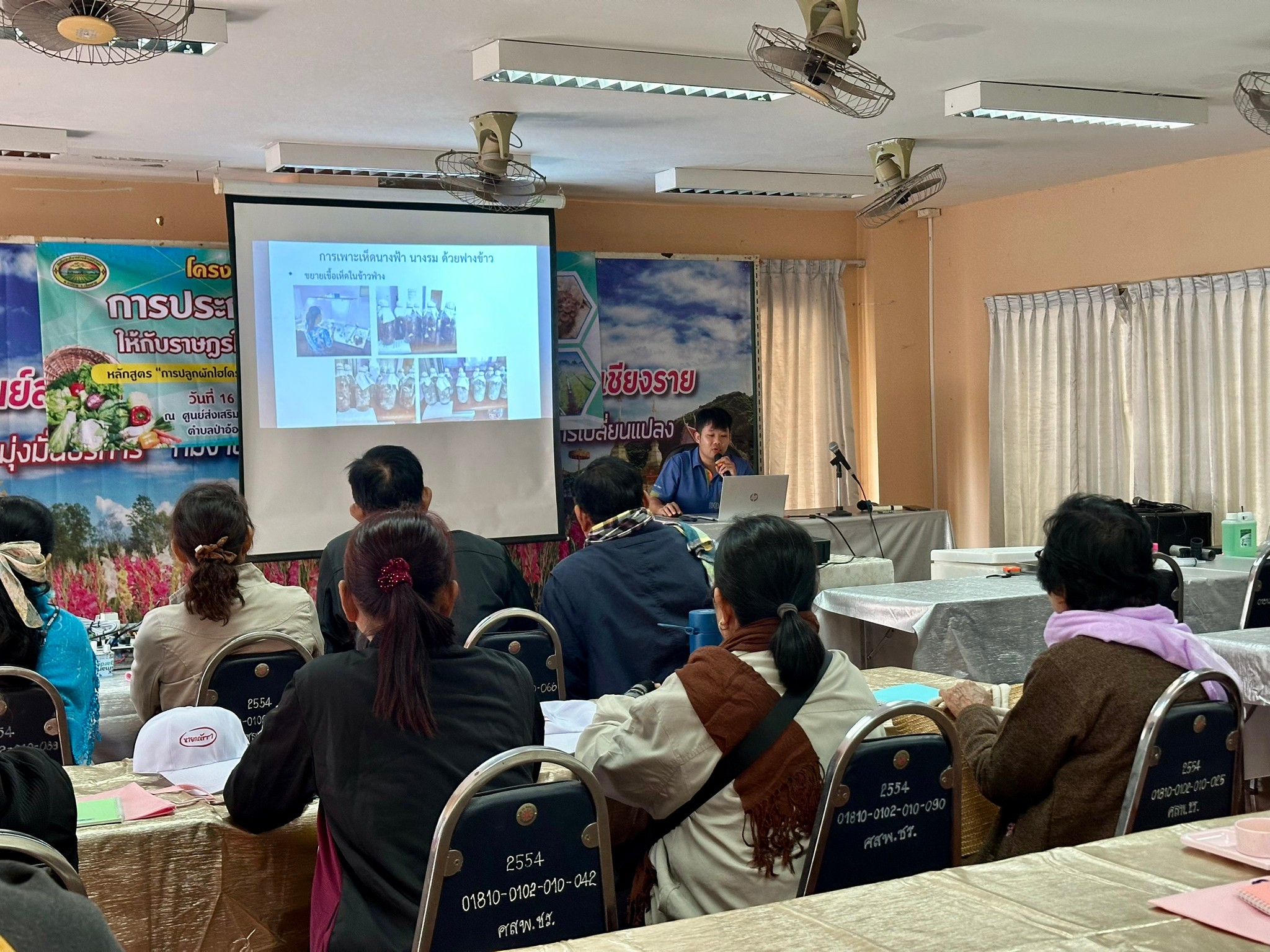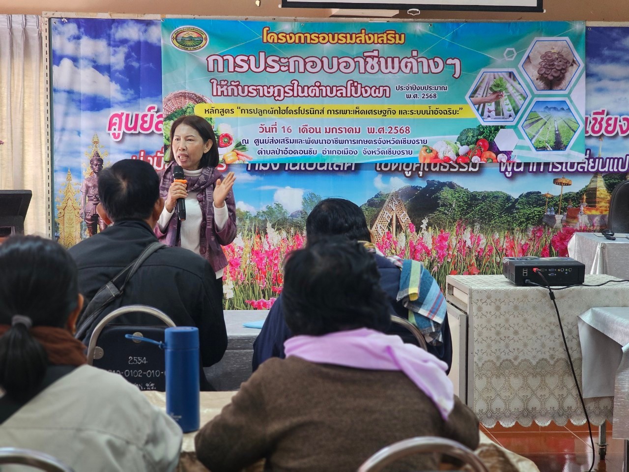 วันที่ 16 มกราคม 2568 เวลา 08.30 น. นางพรรณี สุขใส ผู้อำนวยการศูนย์ส่งเสริมและพัฒนาอาชีพการเกษตรจังหวัดเชียงราย ร่วมกับเจ้าหน้าที่ศูนย์ฯ ให้การต้อนรับคณะศึกษาดูงานจากองค์การบริหารส่วนตำบลโป่งผา อำเภอแม่สาย จังหวัดเชียงราย พร้อมทั้งมอบหมายให้ นายณัฐกุล บุญวงค์ เป็นวิทยากรในการอบรม หลักสูตร “การปลูกผักไฮโดรโปนิกส์ การเพาะเห็ดเศรษฐกิจ และระบบน้ำอัจฉริยะ” ประจำปีงบประมาณ พ.ศ. 2568 ตามโครงการอบรมส่งเสริมการประกอบอาชีพต่างๆให้กับราษฎรในตำบลโป่งผา โดยมีกลุ่มเป้าหมาย และเจ้าหน้าที่ที่ได้รับมอบหมาย เข้าร่วมโครงการฯ จำนวน 34 คน โดยมีวัตถุประสงค์เพื่อส่งเสริมให้กลุ่มเป้าหมายมีองค์ความรู้ที่สามารถพัฒนาเป็นอาชีพเสริม หรืออาชีพทางเลือกที่มั่นคงได้ รวมทั้งการส่งเสริมการผลิตพืชปลอดภัย ลดการใช้สารกำจัดศัตรูพืช และการผลิตพืชในระดับครัวเรือนอย่างเหมาะสม ณ ศูนย์ส่งเสริมและพัฒนาอาชีพการเกษตรจังหวัดเชียงราย ตำบลป่าอ้อดอนชัย อำเภอเมืองเชียงราย จังหวัดเชียงราย