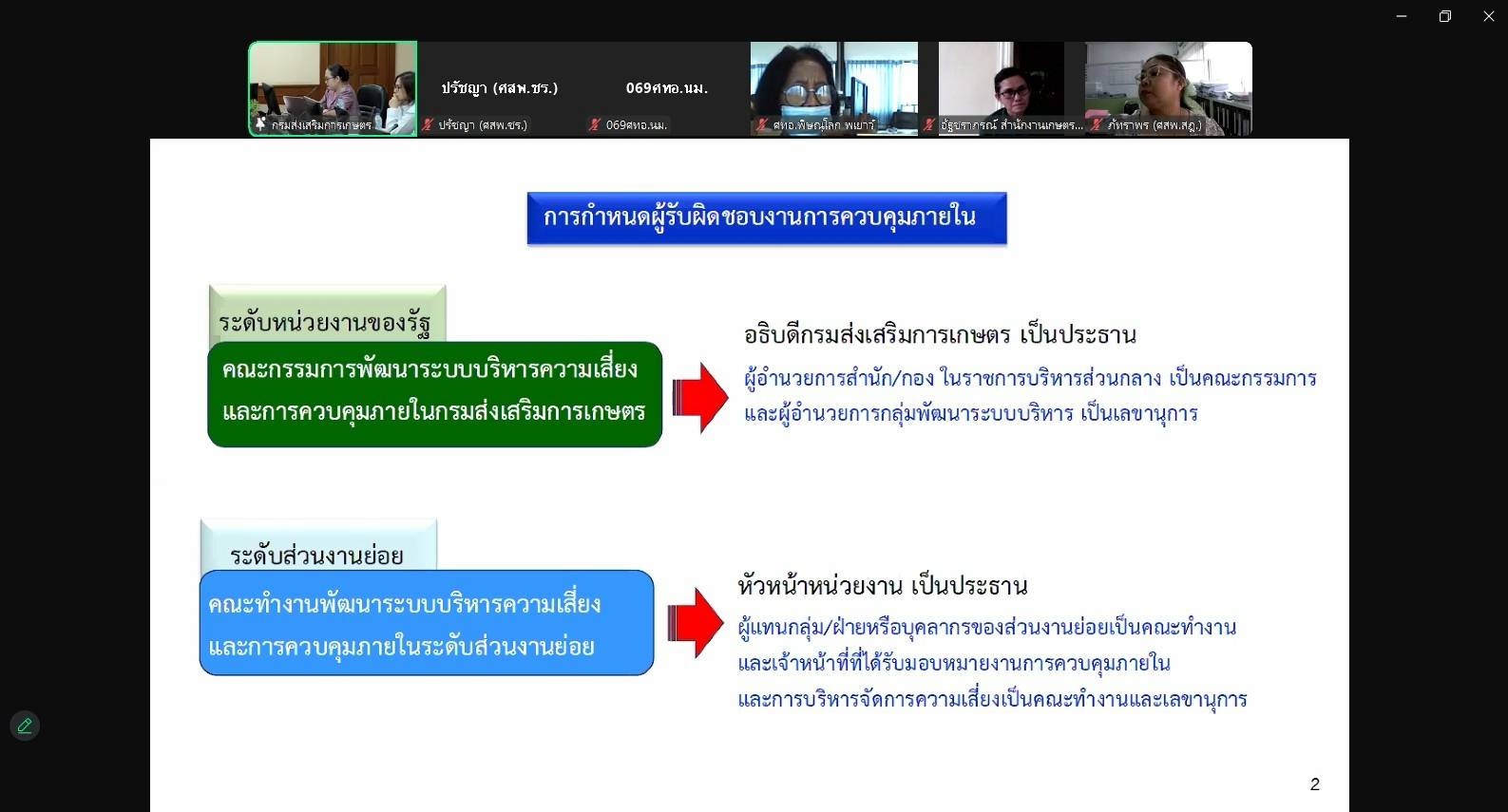 วันที่ 12-13 มีนาคม 2568 เวลา 09.00 น. นางพรรณี สุขใส ผู้อำนวยการศูนย์ส่งเสริมและพัฒนาอาชีพการเกษตรจังหวัดเชียงราย มอบหมายให้นายปรัชญา อยู่อินทร์ เจ้าพนักงานธุรการชำนาญงาน เข้าร่วมประชุมชี้แจงแนวทางการจัดทำรายงานการประเมินผลการควบคุมภายในและการบริหารความเสี่ยง ผ่านระบบออนไลน์ Zoom Meeting. ณ ศูนย์ส่งเสริมและพัฒนาอาชีพการเกษตรจังหวัดเชียงราย เพื่อสร้างความรู้ความเข้าใจสำหรับผู้รับผิดชอบงานการควบคุมภายในและบริหารความเสี่ยงของหน่วยงานเกี่ยวกับการควบคุมภายใน ตามหลักเกณฑ์กระทรวงการคลังว่าด้วยมาตรฐานแลพหลักเกณฑ์ปฏิบัติการควบคุมภายในสำหรับหน่วยงานของรัฐ พ.ศ.2561 และการบริหารจัดการความเสี่ยงสำหรับหน่วยงานของรัฐ พ.ศ.2562