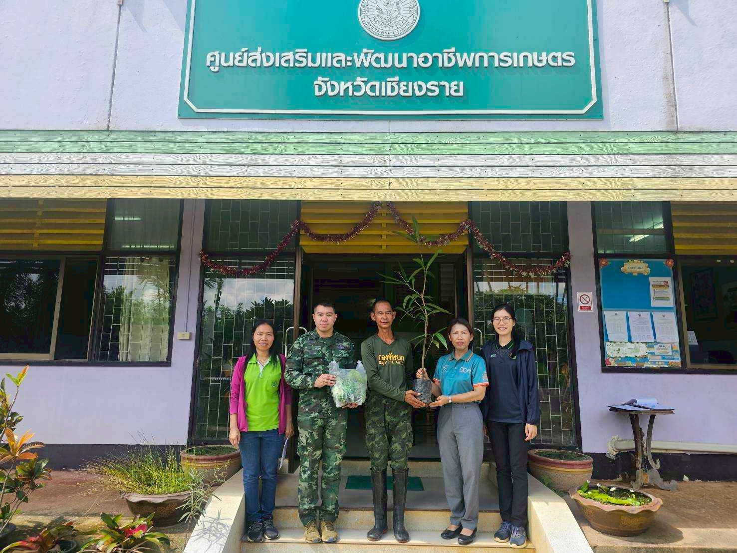 วันที่ 3 กันยายน 2568 นางพรรณี สุขใส ผู้อำนวยการศูนย์ส่งเสริมและพัฒนาอาชีพการเกษตรจังหวัดเชียงราย พร้อมเจ้าหน้าที่ศูนย์ฯ สนับสนุนพันธุ์ต้นกล้ามะม่วงพันธุ์โชคอนันนต์ จำนวน 22 ต้น และกล้ามะเขือเปราะ 30 ต้น ให้แก่มณฑลทหารบกที่ 37 เพื่อปลูกในโครงการทหารพันธุ์ดี อารยเกษตรวิธี มณฑลทหารบกที่ 37 ค่ายเม็งรายมหาราช ตามหลักปรัชญาของเศรษฐกิจพอเพียง และได้ให้คำปรึกษาเกี่ยวกับการการเลี้ยงจิ้งหรีด การปลูกผักไฮโดรโปรนิค ณ ศูนย์ส่งเสริมและพัฒนาอาชีพการเกษตรจังหวัดเชียงราย