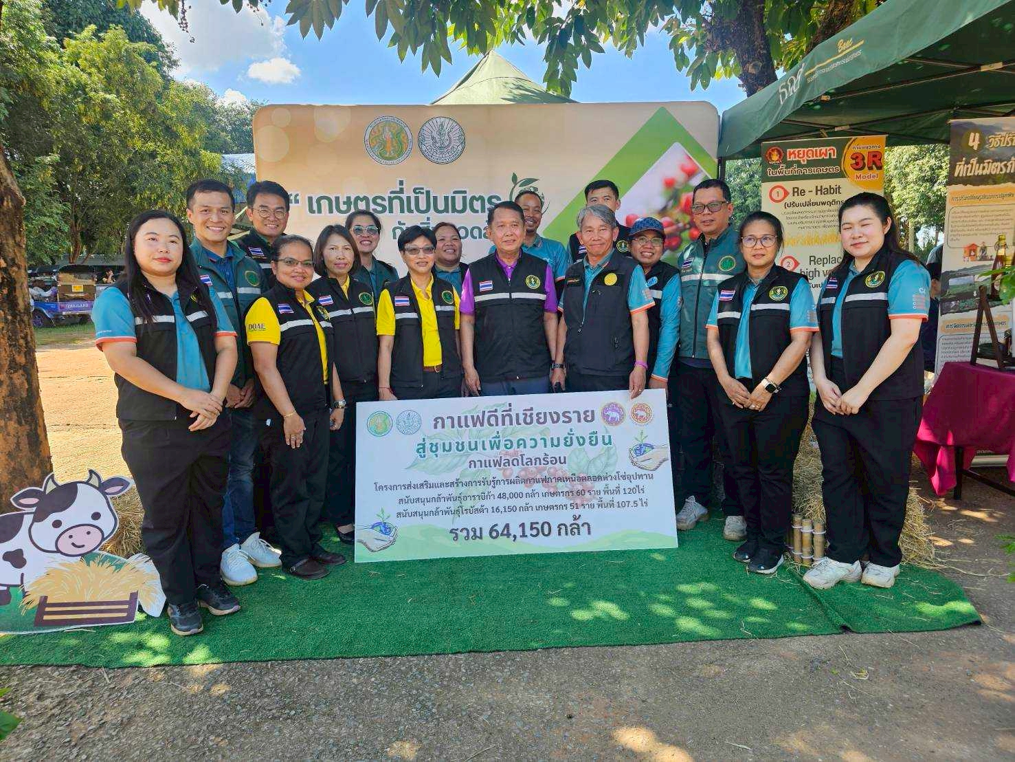วันที่ 11 ตุลาคม 2568 เวลา 10.00 น. นางพรรณี สุขใส ผู้อำนวยการศูนย์ส่งเสริมและพัฒนาอาชีพการเกษตรจังหวัดเชียงราย พร้อมด้วยเจ้าหน้าที่ศูนย์ฯ เข้าร่วมรับมอบนโยบายจากรองนายกรัฐมนตรีและรัฐมนตรีว่าการกระทรวงเกษตรและสหกรณ์ (ร้อยเอก ธรรมนัส พรหมเผ่า) โดยมอบนโยบายหัวหน้าส่วนราชการ ท้องที่ ท้องถิ่น ทั้งจังหวัดเชียงราย ณ หอประชุมใหญ่ มหาวิทยาลัยราชภัฏเชียงราย ตำบลบ้านดู่ อำเภอเมืองเชียงราย จังหวัดเชียงราย และรับฟังปัญหาความต้องการของพื้นที่ จากผู้นำท้องถิ่นอำเภอเวียงชัย อำเภอดอยหลวง และอำเภอเวียงเชียงรุ้ง พบปะประชาชน และมอบสิ่งของ หลังจากนั้น รองนายกรัฐมนตรี และรัฐมนตรีว่าการกระทรวงเกษตรและสหกรณ์ มอบโฉนดเพื่อการเกษตร มอบพันธุ์สัตว์น้ำ หญ้าอาหารสัตว์พระราชทาน น้ำหมักชีวภาพ ต้นกาแฟสายพันธุ์อาราบิก้า และสายพันธุ์โรบัสต้า แก่ตัวแทนเกษตรกร พร้อมทั้งเยี่ยมชมบูธนิทรรศการด้านการเกษตร และปล่อยคาราวานกล้ากาแฟ กิจกรรม Kick off กาแฟดีที่เชียงราย : กาแฟลดโลกร้อน จำนวน 64,150 กล้า ณ ที่ว่าการอำอำเภอเวียงชัย จังหวัดเชียงราย