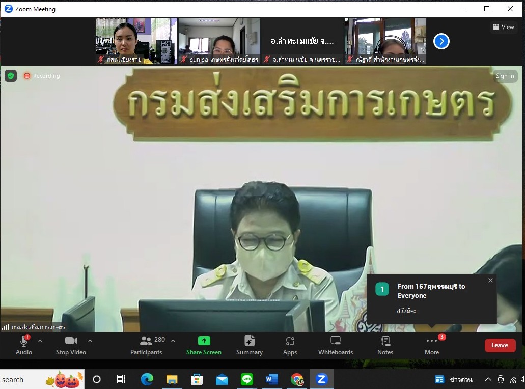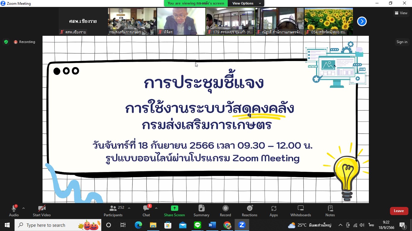 วันที่ 18 กันยายน 2566 นางพรรณี สุขใส ผู้อำนวยการศูนย์ส่งเสริมและพัฒนาอาชีพการเกษตรจังหวัดเชียงราย มอบหมายให้นายปรัชญา อยู่อินทร์เจ้าพนักงานธุรการชำนาญงาน และนางสาวอมรรัตน์ ดวงแก้ว เจ้าพนักงานธุรการ เข้าร่วมประชุมชี้แจงการใช้งานระบบวัสดุคงคลังกรมส่งเสริมการเกษตร ผ่านระบบออนไลน์ Zoom Meeting. จากห้องประชุมศูนย์ปฏิบัติการ ชั้น 2 อาคาร 1 กรมส่งเสริมการเกษตร เพื่อให้หน่วยงานในสังกัดกรมส่งเสริมการเกษตรมีความเข้าใจการใช้งานระบบวัสดุคงคลังกรมส่งเสริมการเกษตร และสามารถจัดทำรายงานมูลค่าวัสดุคงเหลือเพื่อควบคุมเป็นวัสดุคงคลัง(I) ส่งให้กรมส่งเสริมการเกษตรสำหรับปรับปรุงมูลค่าวัสดุคงคลังเหลือ ในระบบ New GFMIS Thai ได้ทันในเวลาที่กรมบัญชีกลางกำหนด ณ ศูนย์ส่งเสริมและพัฒนาอาชีพการเกษตรจังหวัดเชียงราย