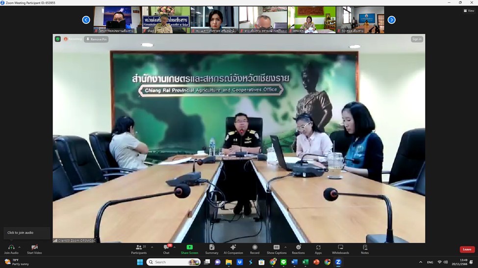 วันที่ 20 พฤศจิกายน 2566 นางพรรณี สุขใส ผู้อำนวยการศูนย์ส่งเสริมและพัฒนาอาชีพการเกษตรจังหวัดเชียงราย และนางวราพร มีสุภา นักวิชาการส่งเสริมการเกษตรชำนาญการ เข้าร่วมประชุมคณะกรรมการขับเคลื่อนงานด้านการเกษตรระดับจังหวัด (Single Command Province : SCP) ครั้งที่ 6/2566 ผ่านระบบออนไลน์ Zoom Meeting. เพื่อขับเคลื่อนนโยบายของรัฐบาล และกระทรวงเกษตรและสหกรณ์ ในราชการส่วนภูมิภาคให้มีความเป็นเอกภาพมีประสิทธิภาพ และเกิดผลสัมฤทธิ์ของการพัฒนาด้านการเกษตรและสหกรณ์ที่เป็นรูปธรรมในภาพรวม โดยมีนายพืชผล น้อยนาฝาย ปศุสัตว์จังหวัดเชียงราย เป็นประธานในการประชุมฯ ณ ศูนย์ส่งเสริมและพัฒนาอาชีพการเกษตรจังหวัดเชียงราย