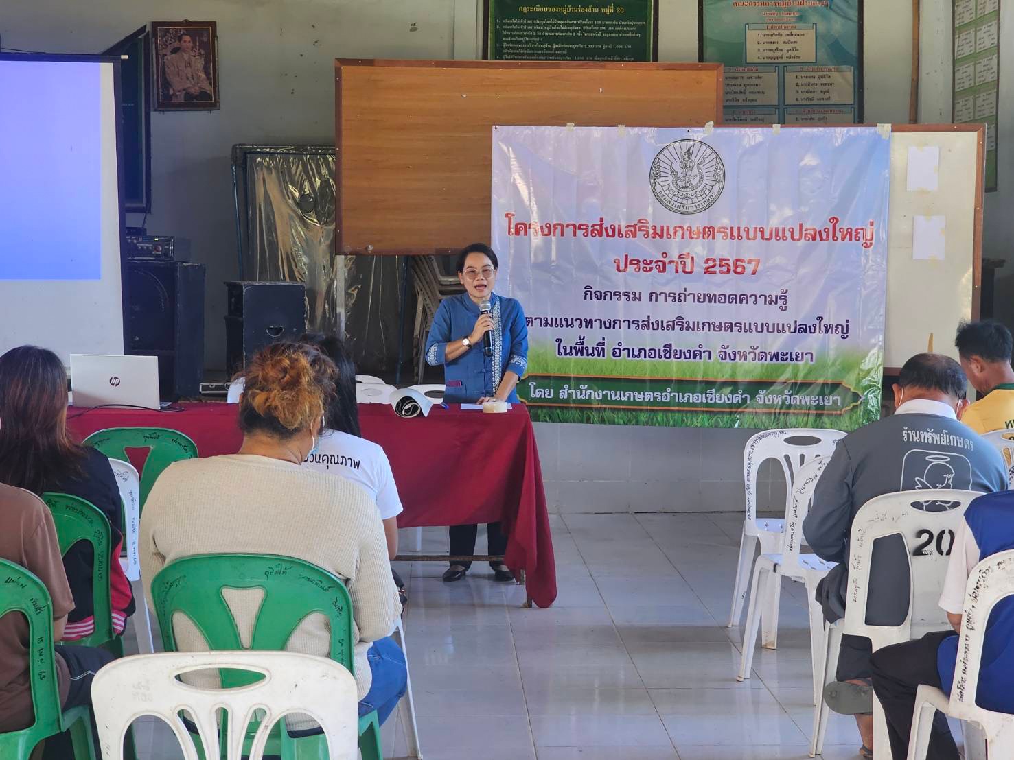 วันที่ 23 พฤศจิกายน 2566 นางพรรณี สุขใส ผู้อำนวยการศูนย์ส่งเสริมและพัฒนาอาชีพการเกษตรจังหวัดเชียงราย มอบหมายให้ นางสาวอ้อ แปงสมุทร นักวิชาการส่งเสริมการเกษตรชำนาญการ นายวรวิทย์ สุขคำปา และนางสาวสุพิมล ทะระถา นักวิชาการส่งเสริมการเกษตรปฏิบัติการ ร่วมเป็นวิทยากรให้ความรู้แก่กลุ่มเกษตรกรแปลงใหญ่มะม่วง สหกรณ์ร่องส้าน ในหัวข้อ “การควบคุมดูแลป้องกันกำจัดโรคแมลงก่อนการส่งออก (ด้วงเจาะเมล็ด)” ณ ศาลาอเนกประสงค์ หมู่ที่ 20 ตำบลร่มเย็น อำเภอเชียงคำ จังหวัดพะเยา