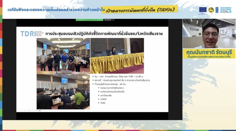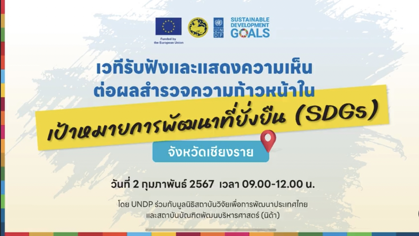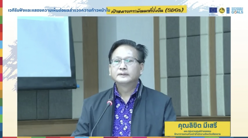วันที่ 2 กุมภาพันธ์ 2567 เวลา 09.30 น. นางพรรณี สุขใส ผู้อำนวยการศูนย์ส่งเสริมและพัฒนาอาชีพการเกษตรจังหวัดเชียงราย เข้าร่วมรับฟังสัมมนาเวทีหารือพหุภาคี เรื่อง ผลสำรวจความก้าวหน้า SDGs ของ 15 จังหวัดนำร่อง ผ่านระบบออนไลน์ (Facebook Page : UNDP) ณ ศูนย์ส่งเสริมและพัฒนาอาชีพการเกษตรจังหวัดเชียงราย เพื่อรับฟังอภิปรายและวิเคราะห์ผลการสำรวจต่อการดำเนินงานด้านความก้าวหน้า SDGs ของ 15 จังหวัดนำร่อง และเพื่อเปิดโอกาสให้ภาคีส่วนต่างๆ ได้ให้ความเห็นต่อผลการสำรวจ รวมถึงให้ข้อเสนอแนะสำหรับการดำเนินงานของจังหวัด อีกทั้งเพื่อให้การขับเคลื่อนเป้าหมายการพัฒนาที่ยั่งยืน SDGs ของจังหวัดเชียงรายเป็นไปด้วยความเรียบร้อย มีประสิทธิภาพในอนาคตต่อไป โดยมีนายลิขิต มีเสรี ผู้อำนวยการศูนย์ดำรงธรรม รักษาราชการแทนหัวหน้าสำนักงานจังหวัดเชียงราย เป็นประธานกล่าวเปิดงานสัมมนาฯ