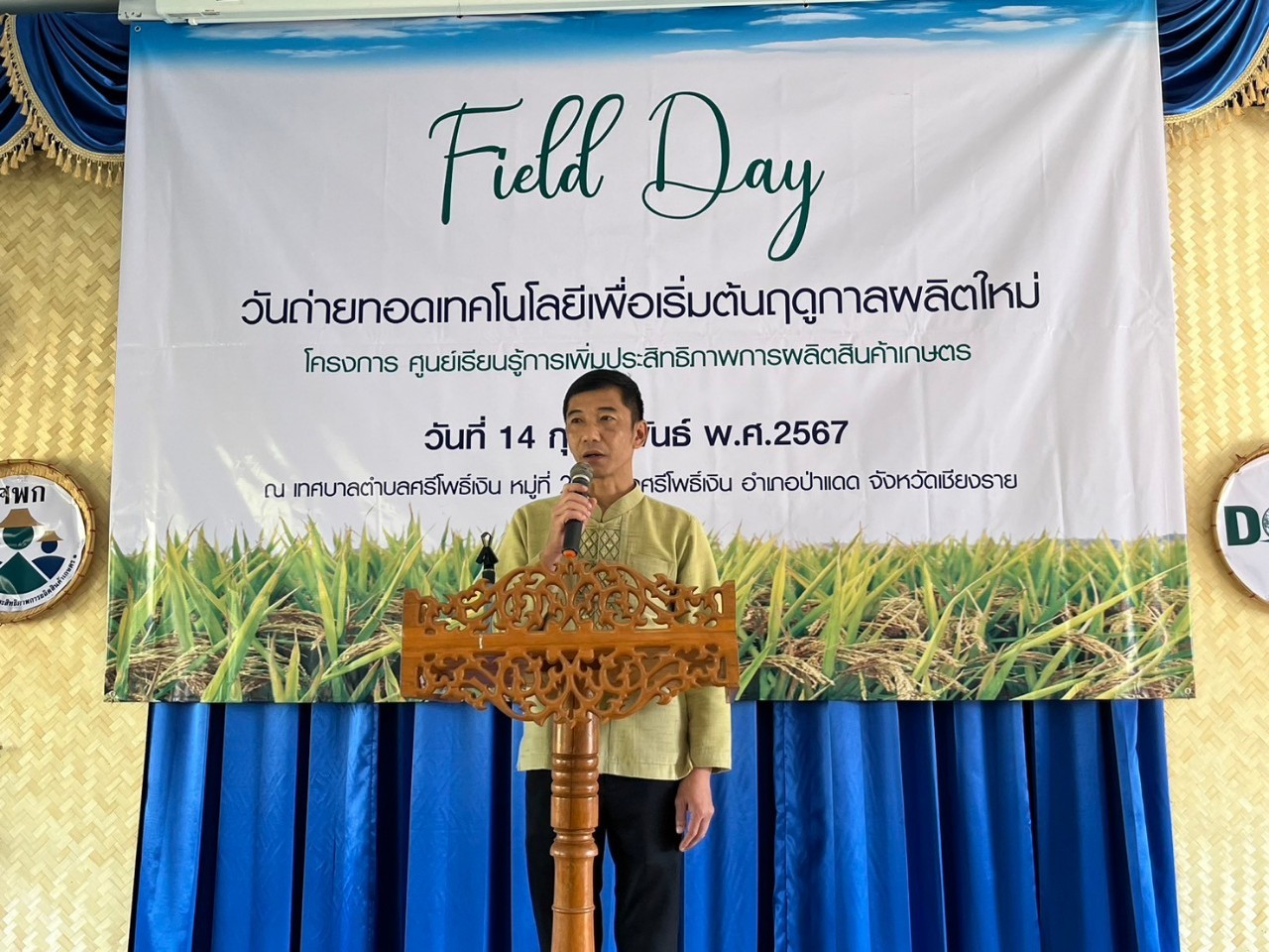 วันที่ 14 กุมภาพันธ์ 2567 เวลา 08.30 น. นางพรรณี สุขใส ผู้อำนวยการศูนย์ส่งเสริมและพัฒนาอาชีพการเกษตรจังหวัดเชียงราย มอบหมายให้นักวิชาการส่งเสริมการเกษตร ร่วมจัดนิทรรศการวันถ่ายทอดเทคโนโลยีเพื่อเริ่มต้นฤดูกาลผลิตใหม่ (Field Day) ปี2567 เพื่อเป็นการผสมผสานระหว่างเทคโนโลยีที่หน่วยงานราชการส่งเสริมกับภูมิปัญญาของเกษตรกร มีการประยุกต์ใช้ให้มีความเหมาะสมอย่างเฉพาะเจาะจงกับสภาพแวดล้อมของพื้นที่นั้นๆ โดยผ่านกลไกของศูนย์เรียนรู้การเพิ่มประสิทธิภาพการผลิตสินค้าเกษตร (ศพก.) และหน่วยงานต่างๆ มีการให้บริการด้านการเกษตร เพื่อสนับสนุนเกษตรกรเริ่มต้นการผลิตในปีการเพาะปลูกใหม่ ทั้งนี้ศูนย์ฯ ได้จัดนิทรรศการ และให้การสนับสนุนเมล็ดพันธุ์ผักกวางตุ้ง แก่เกษตรกรที่ร่วมงานฯ ณ เทศบาลตำบลศรีโพธิ์เงิน หมู่ที่ 2 ตำบลศรีโพธิ์เงิน อำเภอป่าแดด จังหวัดเชียงราย โดยมีนายสุรเชษฐ์ พุ้ยน้อย นายอำเภอป่าแดด เป็นประธานกล่าวเปิดงานฯ