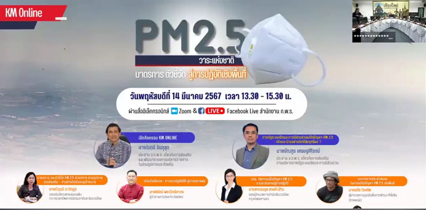วันที่ 14 มีนาคม 2567 เวลา 13.30 น. นางพรรณี สุขใส ผู้อำนวยการศูนย์ส่งเสริมและพัฒนาอาชีพการเกษตรจังหวัดเชียงราย ร่วมรับฟังชี้แจงทำความเข้าใจ กิจกรรม KM Online หัวข้อ “PM 2.5 วาระแห่งชาติ มาตรการ ตัวชี้วัด สู่การปฏิบัติเชิงพื้นที่” ผ่านระบบออนไลน์ (Zoom และ Facebook Live สำนักงาน ก.พ.ร.) ซึ่งสำนักงาน ก.พ.ร. พิจารณาเห็นว่า ปัญหา PM 2.5 เป็นวาระแห่งชาติที่ทุกภาคส่วนต้องเข้ามามีส่วนร่วมและบูรณาการการทำงานทั้งส่วนกลาง ส่วนภูมิภาค และส่วนท้องถิ่น เพื่อป้องกันและแก้ไขปัญหาอย่างเร่งด่วน ตรงจุด ตอบโจทย์พื้นที่ และเสริมสร้างคุณภาพชีวิตที่ดีขึ้นของประชาชน รวมทั้งเกิดผลสัมฤทธิ์เป็นรูปธรรมอย่างยั่งยืนต่อไป ณ ศูนย์ส่งเสริมและพัฒนาอาชีพการเกษตรจังหวัดเชียงราย ตำบลป่าอ้อดอนชัย อำเภอเมืองเชียงราย จังหวัดเชียงราย