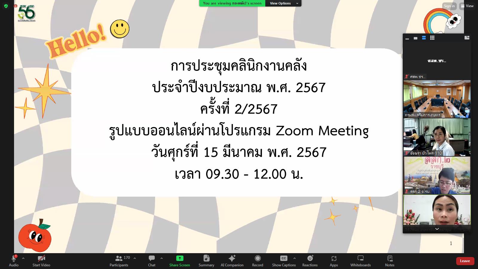 วันที่ 15 มีนาคม 2567 เวลา 09.30 น. นางพรรณี สุขใส ผู้อำนวยการศูนย์ส่งเสริมและพัฒนาการเกษตรจังหวัดเชียงราย เข้าร่วมประชุมคลินิกงานคลัง ประจำปีงบประมาณ พ.ศ.2567 ครั้งที่ 2/2567 ผ่านโปรแกรม Zoom Meeting. จากห้องประชุม 4/1 ชั้น 4 อาคาร 1 กรมส่งเสริมการเกษตร เพื่อสร้างการรับรู้ แลกเปลี่ยนเรียนรู้ ให้คำปรึกษาและคำแนะนำในการปฏิบัติงาน รวมทั้งติดตามผลการดำเนินงานด้านการบริหารงานคลังของหน่วยงายในสังกัดกรมส่งเสริมการเกษตร โดยมีนางอัญชลี สุวจิตตานนท์ รองอธิบดีกรมส่งเสริมการเกษตร กรมส่งเสริมการเกษตร เป็นประธานในการประชุมฯ ณ ศูนย์ส่งเสริมและพัฒนาอาชีพการเกษตรจังหวัดเชียงราย