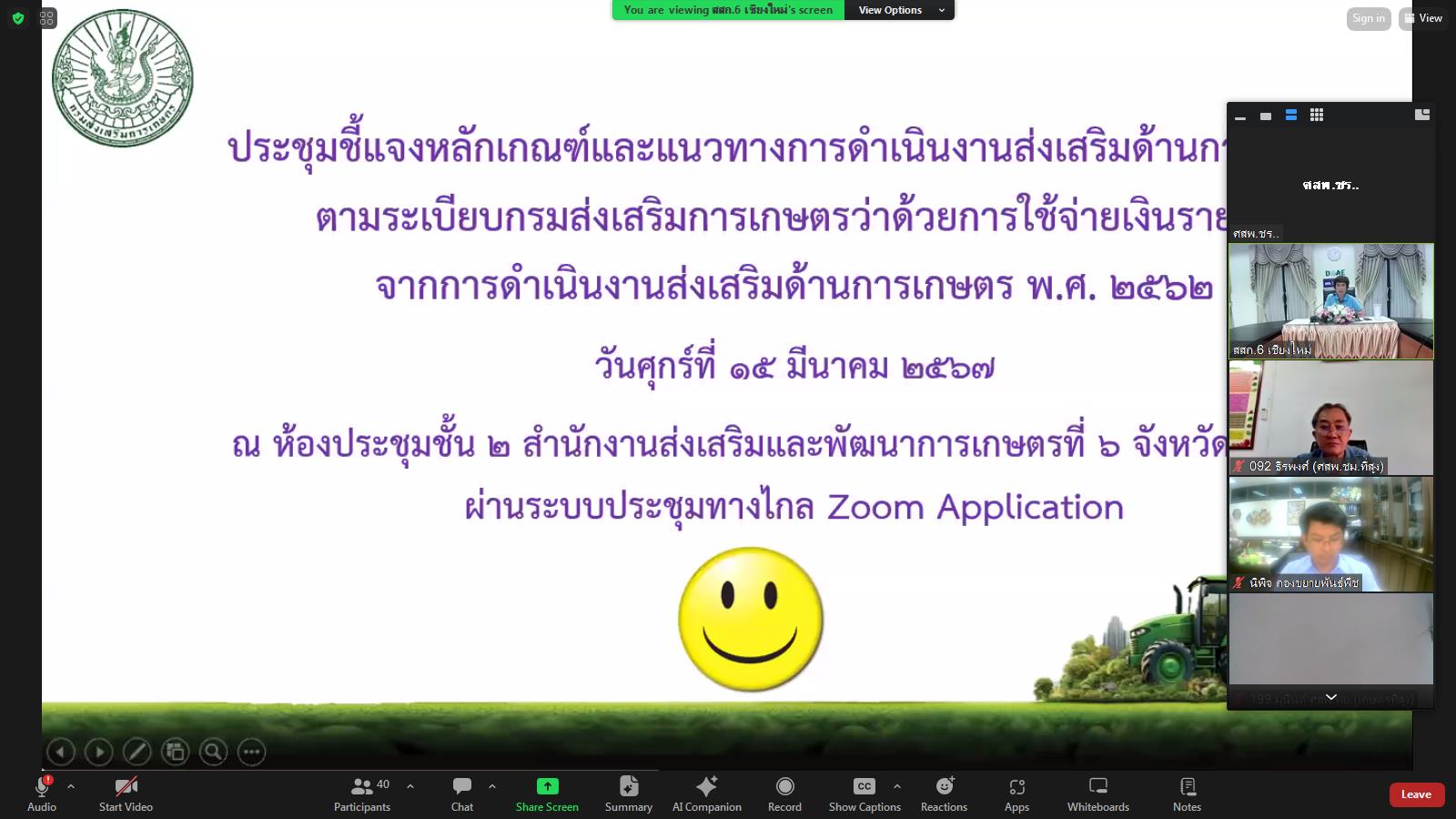 วันที่ 15 มีนาคม 2567 เวลา 13.30 น. นางพรรณี สุขใส ผู้อำนวยการศูนย์ส่งเสริมและพัฒนาการเกษตรจังหวัดเชียงราย และนางวราพร มีสุภา นักวิชาการส่งเสริมการเกษตรชำนาญการ เข้าร่วมประชุมชี้แจงหลักเกณฑ์และแนวทางการดำเนินงานส่งเสริมด้านการเกษตร ว่าด้วยการใช้จ่ายเงินรายได้ จากการดำเนินงานส่งเสริมด้านการเกษตร พ.ศ.2562 ผ่านระบบออนไลน์ Zoom Meeting. จากห้องประชุม 2 สำนักงานส่งเสริมและพัฒนาการเกษตรที่ 6 จังหวัดเชียงใหม่ ณ ศูนย์ส่งเสริมและพัฒนาอาชีพการเกษตรจังหวัดเชียงราย เพื่อรับทราบและทำความเข้าใจในกฎหมาย กฎ ระเบียบที่เกี่ยวข้องกับการปฏิบัติงาน และการแลกเปลี่ยนเรียนรู้การดำเนินงาน รวมถึงการนำประเด็น ปัญหา อุปสรรคที่เกิดขึ้นของการทำงานที่ผ่านมา เพื่อพิจารณาร่วมกัน ป้องกันไม่ให้เกิดทุจริต ลดความเสี่ยงในการปฏิบัติงานของเจ้าหน้าที่ผู้ปฏิบัติงาน และผู้ที่เกี่ยวข้อง โดยมีนางสาวพนิดา ศรีพรม หัวหน้าฝ่านบริหารทั่วไป สำนักงานส่งเสริมและพัฒนาการเกษตรที่ 6 จังหวัดเชียงใหม่ เป็นประธานในการประชุมฯ